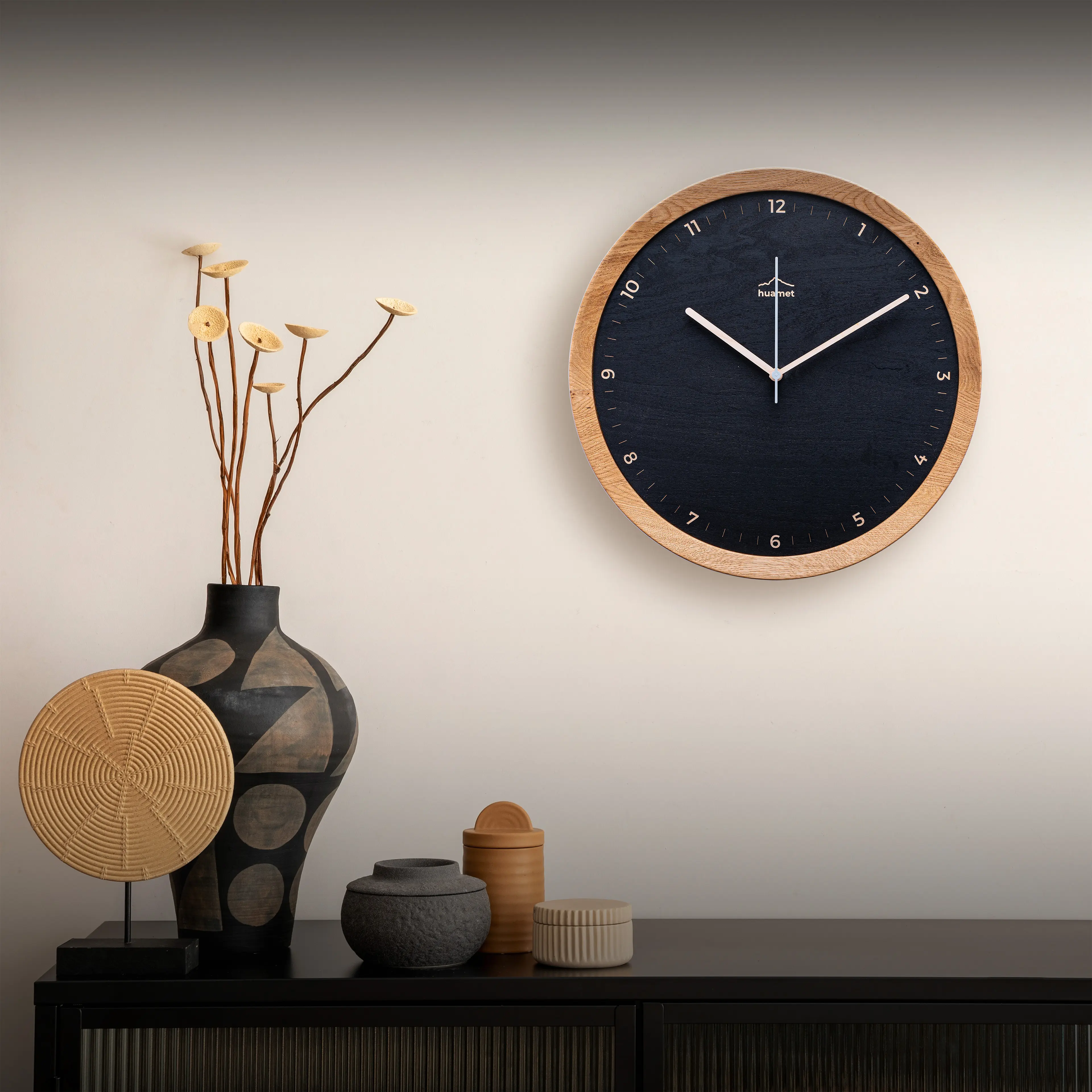 Entdecke unsere Wanduhr "BLACK" aus massiv verleimten Eichenholz – Ein weiteres Meisterwerk von huamet!